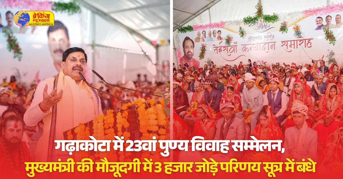 मध्यप्रदेश के सागर जिले के गढ़ाकोटा में आयोजित 23वें पुण्य विवाह सम्मेलन में गुरुवार को लगभग 3000 जोड़ों ने सामूहिक विवाह के बंधन में बंधकर एक नई शुरुआत की। इस आयोजन में मुख्यमंत्री डॉ. मोहन यादव स्वयं शामिल हुए और समाज को पुनर्विवाह की मानवीय सोच अपनाने का संदेश दिया।