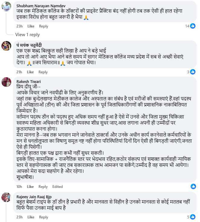 इस पोस्ट के सामने आने के बाद सोशल मीडिया पर ना सिर्फ बुंदेलखंड मेडिकल कॉलेज बल्कि प्रदेश की स्वास्थ्य सुविधाओं पर बहस छिड़ गयी है, जिसके कुछ कमेंट्स हम आपके साथ शेयर कर रहें है ।