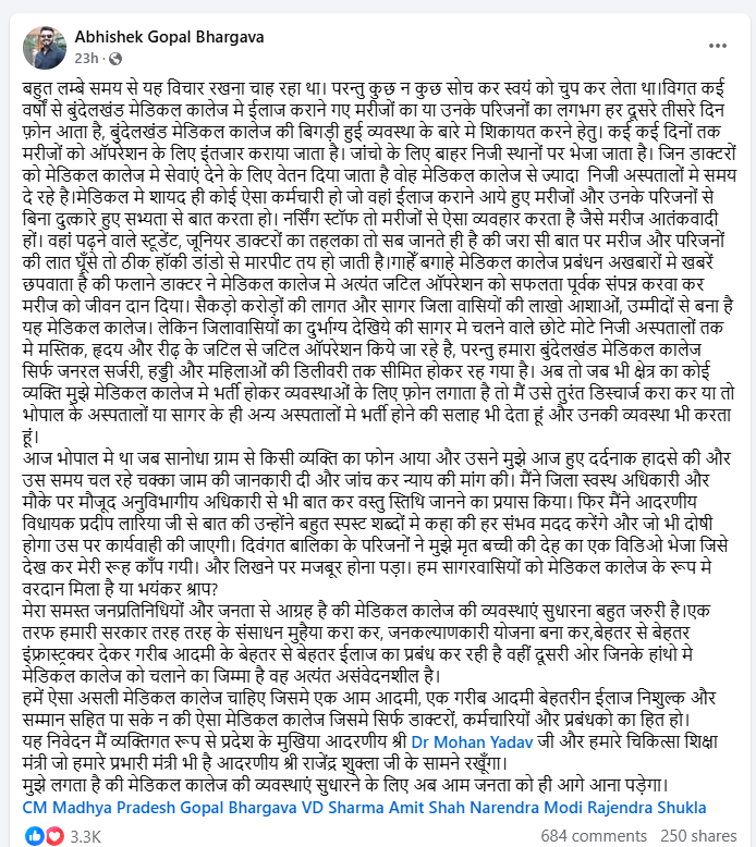 इसका ताजा उदाहरण पेश किया है अभिषेक भार्गव (दीपू) ने, वैसे तो दीपू भार्गव किसी पहचान के मोहताज नहीं क्यूंकि उनके साथ जुड़ा है मप्र के सबसे वरिष्ठ विधायक और पूर्व मंत्री गोपाल भार्गव के पुत्र होने का नाम, किन्तु इसके बावजूद वो स्वयं ही समय समय पर जनहितेषी मुद्दों को उठाते रहते है और एक बार फिर उन्होंने सोशल मीडिया फेसबुक पर लम्बी चौड़ी पोस्ट लिखकर ‘;बुंदेलखंड मेडिकल कालेज’ की बिगड़ी स्वास्थ्य सेवाएं और अव्यवस्थाओं पर सवाल खड़े किये है । जिसमें उन्होंने लिखा कि