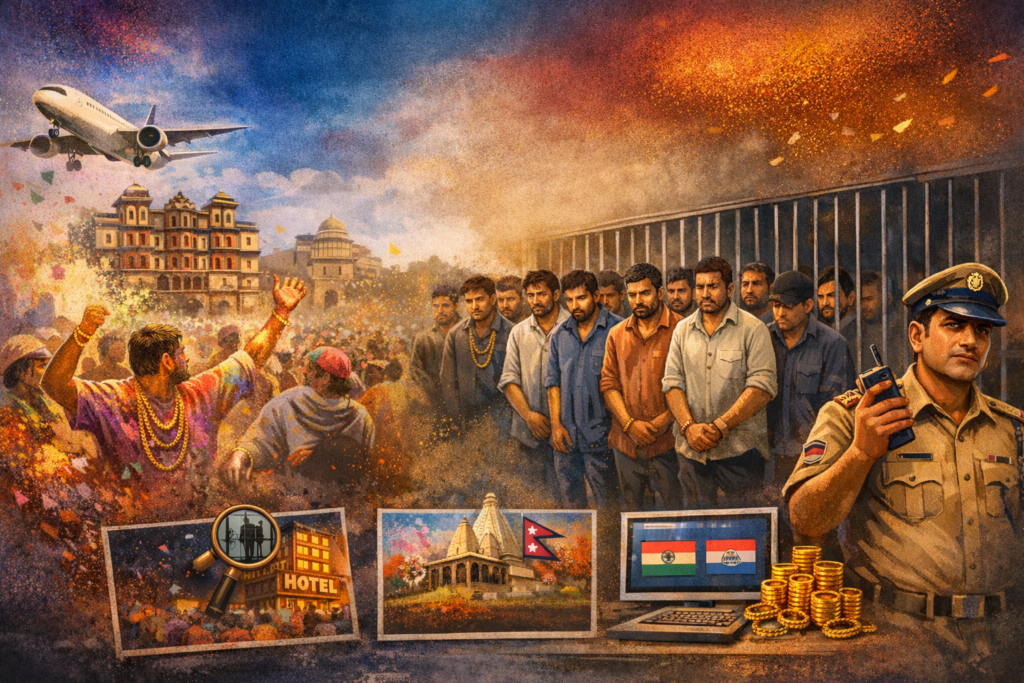 इंदौर की ऐतिहासिक रंगपंचमी गेर को निशाना बनाकर बड़ी वारदात की साजिश रची जा रही थी, जिसे पुलिस की सतर्कता ने समय रहते नाकाम कर दिया। शहर के छोटी ग्वालटोली इलाके के एक होटल से पुलिस ने नेपाल और बिहार से जुड़े 20 संदिग्धों को गिरफ्तार कर जेल भेज दिया है। पुलिस को आशंका है कि ये लोग गेर के दौरान भीड़ में शामिल लोगों की सोने की चेन लूटने की योजना बना रहे थे।